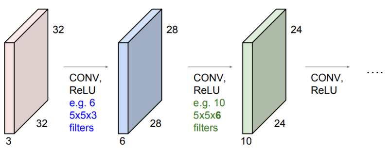 1. Convolution Layer(1)에서 필터를 사용해서 32x32x3 크기의 입력 이미지를 처리하면, 결과로 28x28x6 크기의 activation map이 나오게된다.
