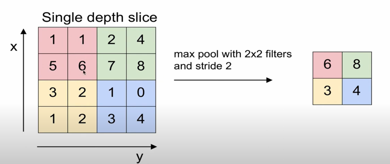 N은 4, F는 2, Stride는 2이기 때문에 ((4 - 2) / 2) + 1은 2이다. 따라서 2x2가 나온다.