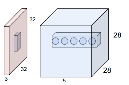 5x5x3 Filter가 입력 받은 32x32x3 사진을 순차적으로 훓으면서 필터가 해당 되는 이미지의 부분과 필터를 dot product 연산을 적용해서 하나의 수를 도출한다.