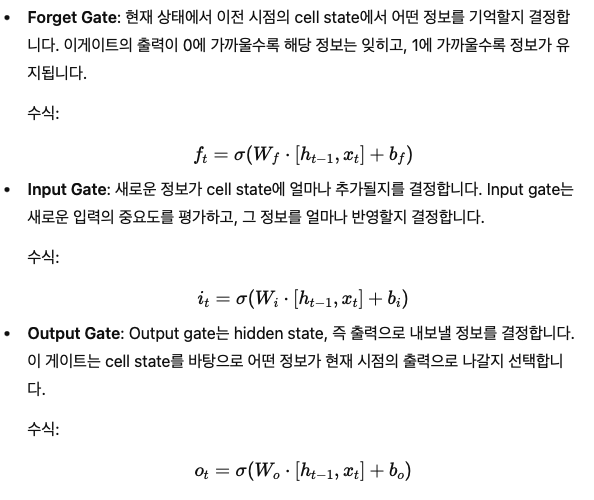 - LSTM: LSTM은 게이트 메커니즘을 통해 정보를 효율적으로 처리합니다. LSTM에는 세 가지 주요 게이트가 있다: