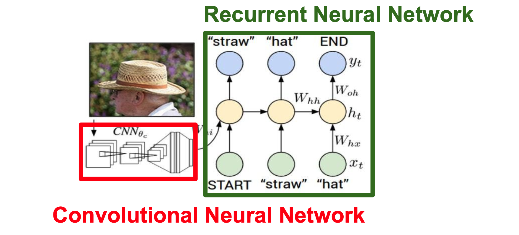 - CNN에서 추출한 이미지의 특징 벡터는 RNN의 초기 입력으로 들어간다. 이 벡터는 RNN에 의해 첫 번째 단어를 생성하기 위한 정보로 사용된다.