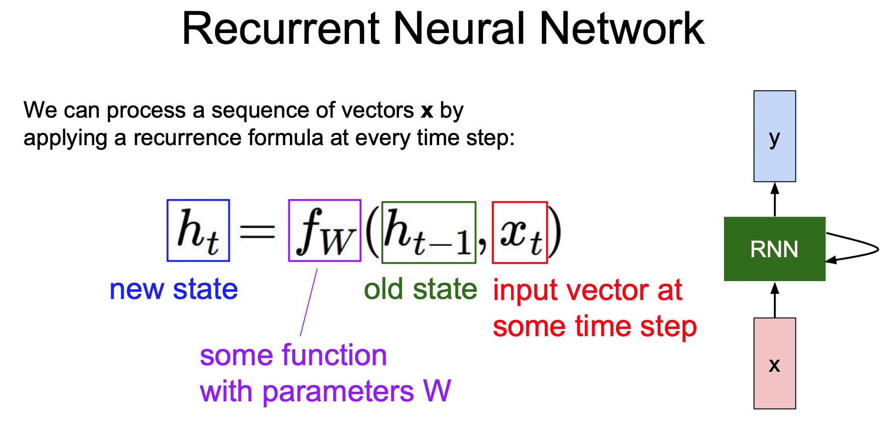 여기서 중요한 것은 모든 입력 시퀀스 데이터가 들어올 때는 같은 함수, 매개변수W를 사용해야한다는 것이다.