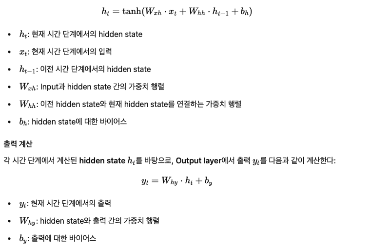 - Hidden Layer는 이전 단계에서 계산된 hidden state와 현재 입력을 결합해서 새로운 hidden state를 만든다.