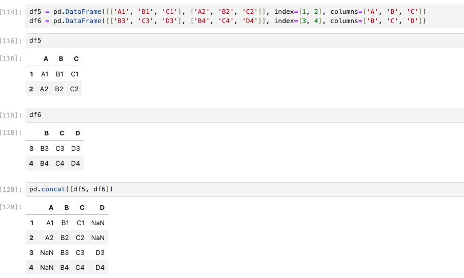 열이 중복된다면 중복되는 열은 추가하고 중복 되지 않는 열의 행 부분은 NaN 값으로 채운다.