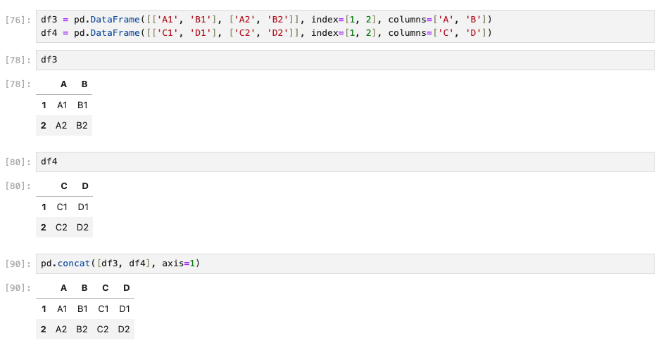 : 주로 행 추가 또는 열추가를 결합하는데 사용하는 연산 메소드이다. 기본 값은 행 추가이며, axis='col'(2.2.2에서는 axis=1)을 하면 열 추가도 가능하다.