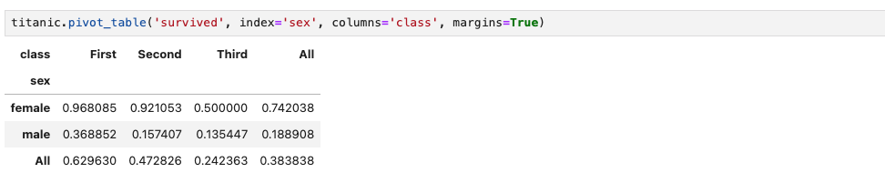 이렇게 pivot table을 이용하면, 간단하게 행과 열을 기준으로 특정 값에 대한 연산을 할 수 있다. pivot table의 기본 연산은 mean이기 때문에 아무 코드 추가 없이도 생존자 여부의 평균을 계산할 수 있다.