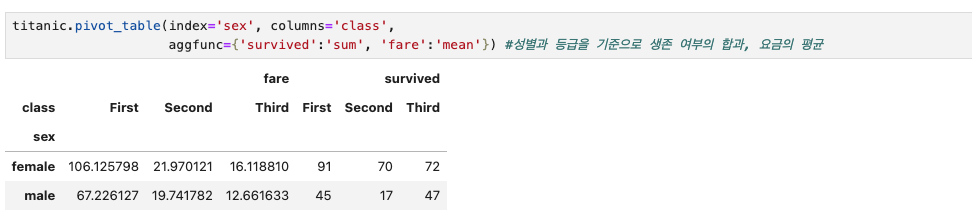 데이터 프레임 명.pivot_table(연산할 컬럼, index=기준이 되는 행, columns=기준이 되는 열)